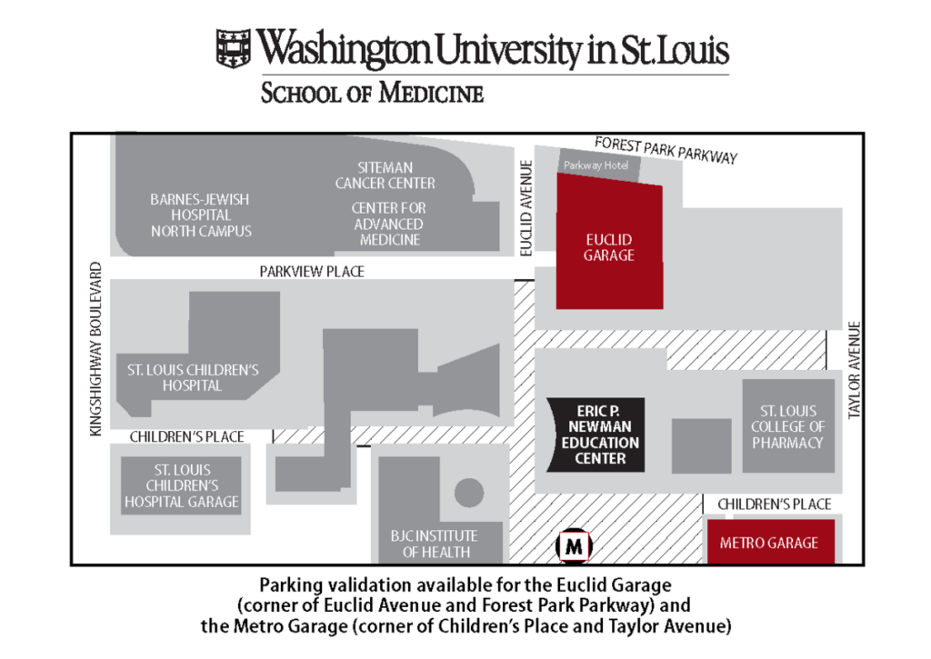 Parking validation available for the Euclid Garage (corner of Euclid Avenue and Forest Park Parkway) and the Metro Garage (corner of Children’s Place and Taylor Avenue)